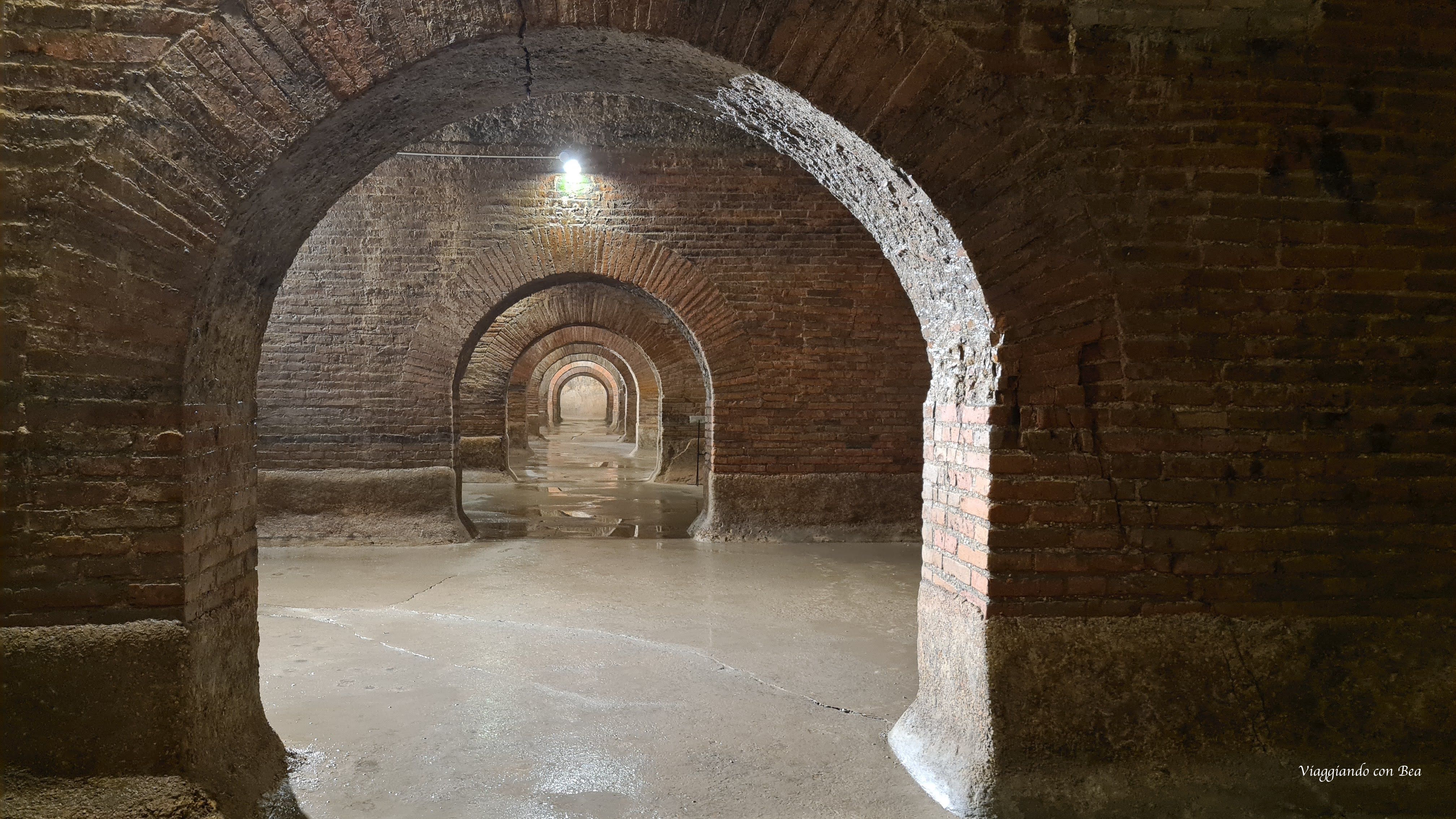 Si percorre la caratteristica via degli Aceti ed eccoci all’ingresso di un vasto complesso sotterraneo formato da 30 ambienti. Queste gallerie furono realizzate tra il 40 ed il 60 d.C. al fine di raccogliere e depurare l’acqua piovana e sorgiva che alimentava l’acquedotto cittadino. Le sale godevano di un buon ricircolo d’aria grazie all’altezza dei soffitti ed ai pozzi d’areazione.