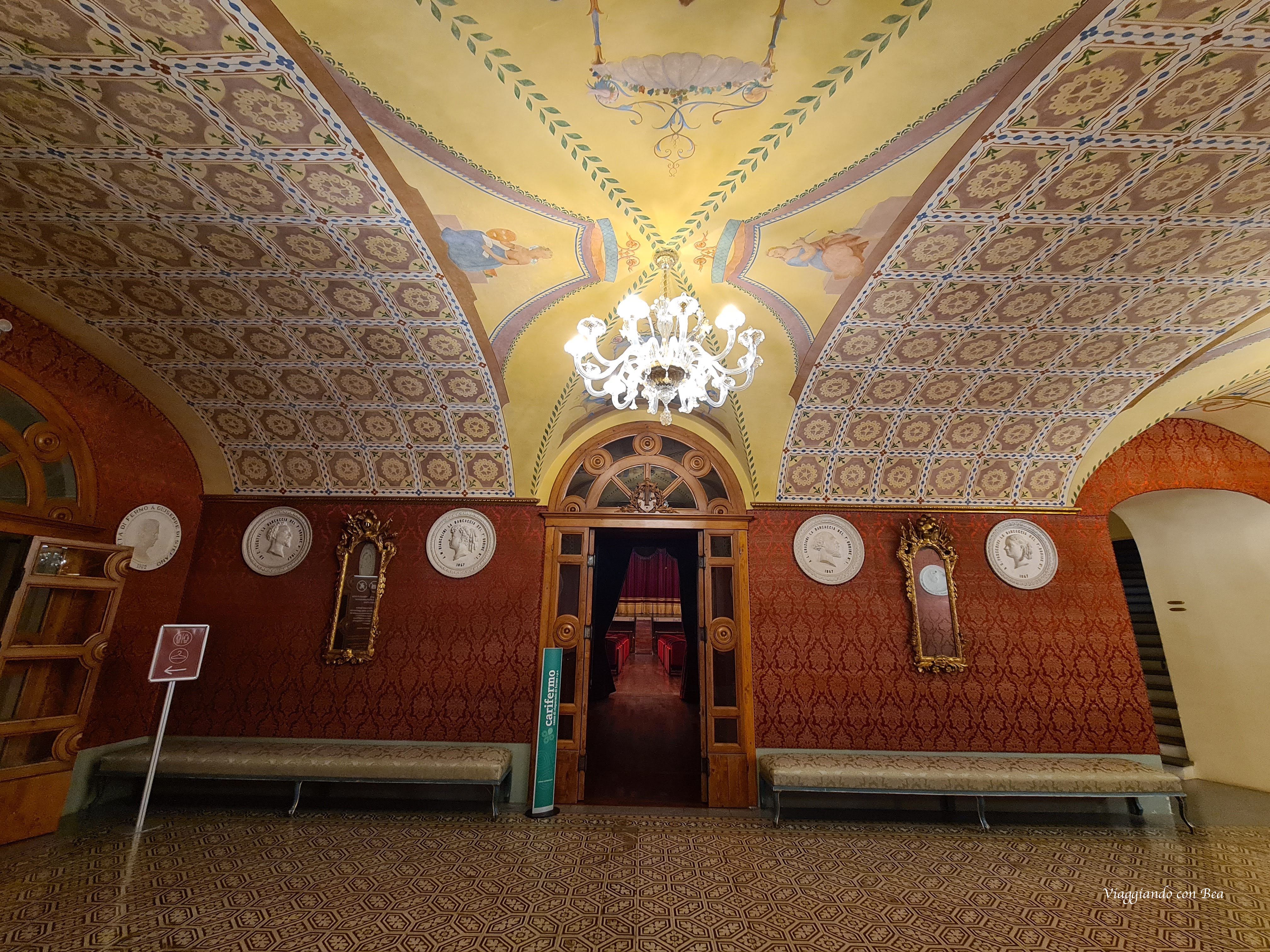 Dopo questo sguardo a 360° verso la piazza, è ora di iniziare la vera visita. Entriamo nell’ufficio IAT, posto al piano terra del Palazzo dei Priori, e qui scopriamo che con un biglietto unico di soli 8 euro è possibile visitare tutti gli interni che avevamo nel nostro programma. Siamo rimasti colpiti dalla perfetta organizzazione della visita. Siamo stati informati sia degli orari che dei tempi che occorrevano per le visite e siamo stati accompagnati da una guida all’interno sia del settecentesco Teatro dell’Aquila che in quello delle suggestive Cisterne.