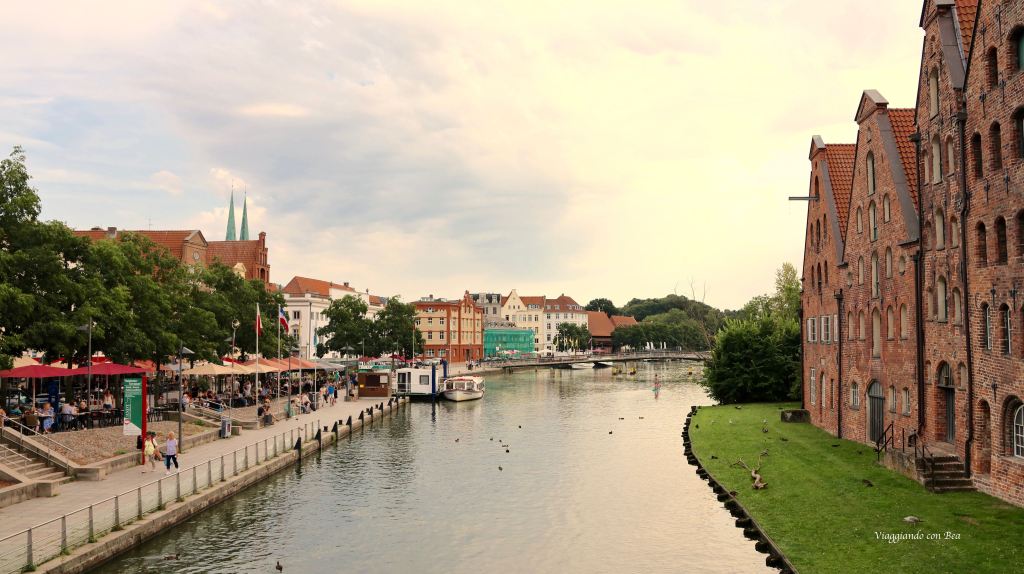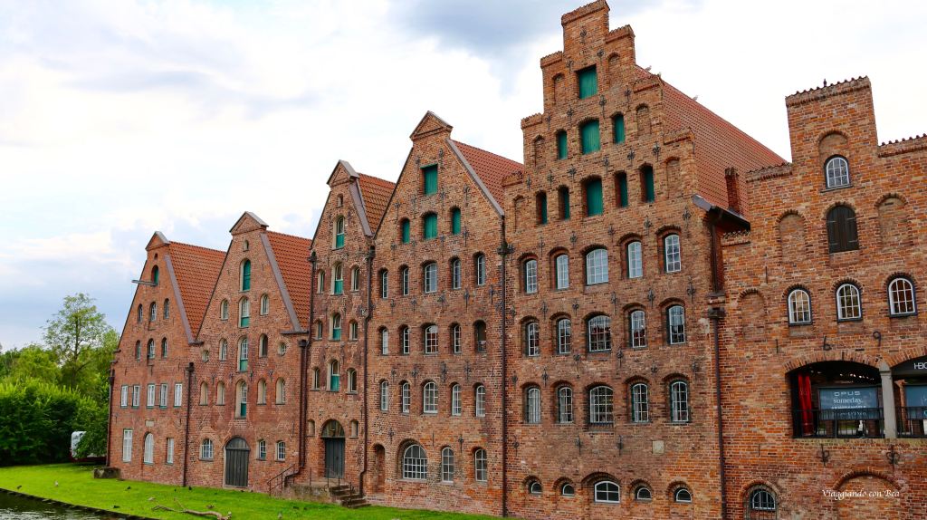 dal ponte si ha un magnifico colpo d’occhio verso gli antichi Salzpeicher (depositi di sale) che si affacciano sul fiume Trave. E’ un gruppo di sei edifici in stile rinascimentale baltico costruiti, tra il ‘500 ed il ‘700, in laterizio con struttura architettonica a frontoni. Questi edifici venivano utilizzati per immagazzinare il sale proveniente da Luneburg e poi da qui veniva portato verso la Scandinavia e la Norvegia.