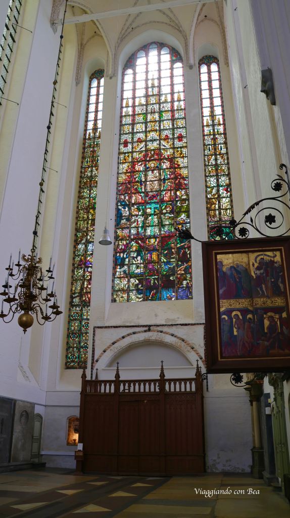 Vedo che sfortunatamente non ho fotografato il fonte battesimale in bronzo del 1290 ed invece ecco, in tutto il suo splendore, la vetrata, alta ben 26 metri, del portale sud del transetto. Questa vetrata raffigura il giorno del giudizio ed è una delle più grandi vetrate singole in Europa.