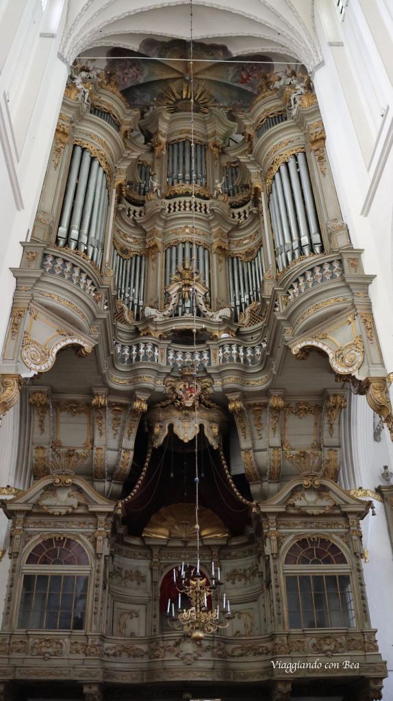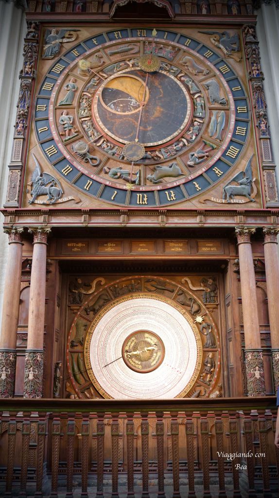 Seguendo l’opuscolo che ci hanno dato all’ingresso dirigiamo i nostri passi verso il pulpito, realizzato in stile rinascimentale da Rudolf Stockmann nel 1574. In esso si possono ammirare scene della passione di Gesù che iniziano da destra con l’adorazione dei pastori e terminano con la risurrezione di Cristo. Il baldacchino barocco annesso al pulpito è del 1723. Sul lato opposto all’altare maggiore, e precisamente sopra l’ingresso, notiamo un meraviglioso organo del 1766. Spostandoci dietro l’altare troviamo un arredo di pregio e cioè il più antico orologio astronomico funzionante della Germania del nord. Opera del 1472 realizzata da Hans Düringer di Norimberga. Nella parte inferiore notiamo un anello con i segni zodiacali e in rilievo le figure di quattro Re Magi. Nella parte superiore ecco il quadrante dell’orologio con le fasi lunari e con simboli degli evangelisti. Sia l’orologio principale che il movimento del calendario vengono caricati manualmente ogni giorno. Il carillon suona ogni ora allo scoccare dell’ora. Su internet leggo che questo strumento funziona ancora con il meccanismo del periodo medievale rendendolo un pezzo unico al mondo.