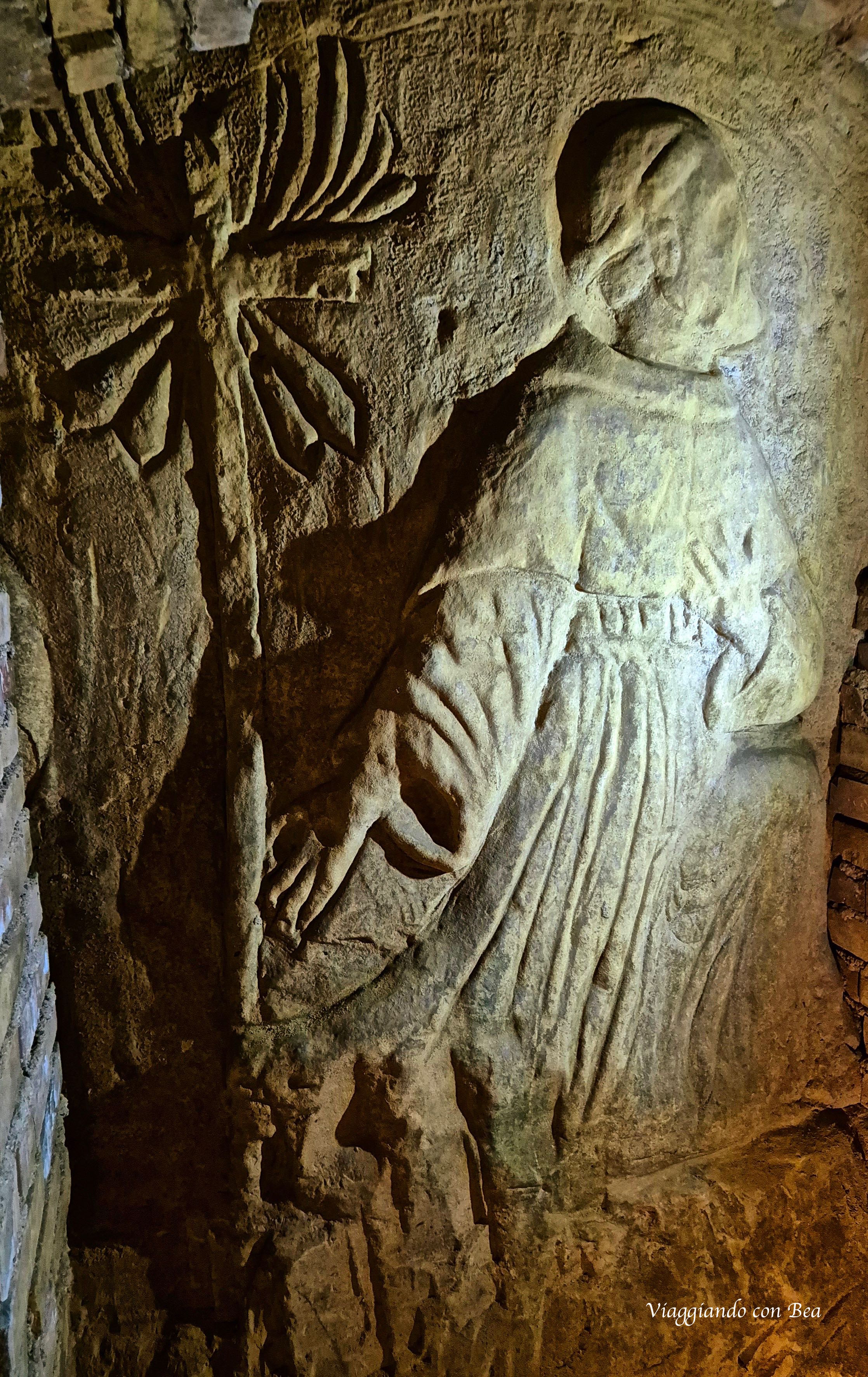 Non appena scendi non puoi non rimanere colpito da quella misteriosa luce soffusa che ti circonda e che quasi nasconde quel susseguirsi di arcate. I bassorilievi e le figure incisi nell’arenaria dalle mani dell’uomo raffigurano simboli religiosi, croci e santi che ci vengono spiegati in modo molto dettagliato dalla nostra guida.