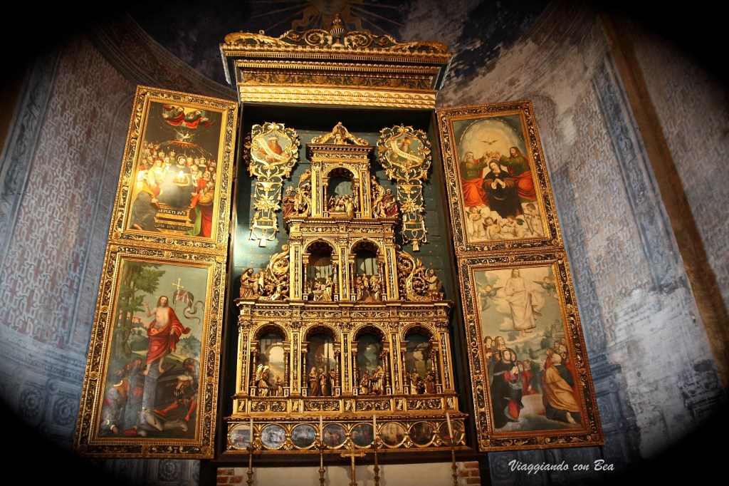 Mi ha molto colpito la chiesa di San Giovanni per l’atmosfera mistica che vi si respira. La sua semplice facciata appare all’improvviso nascosta in una suggestiva piazzetta ai piedi della Torre Civica. Ciò che colpisce maggiormente è il suo interno al quale vi si accede scendendo una gradinata che porta alla navata centrale. Lungo le navate laterali possiamo notare varie cappelle ornate da magnifici affreschi del secolo XV. Bellissimo il trittico di Pascale Oddone dedicato alla Madonna che si trova nella Cappella del Rosario. Andando verso l’altare maggiore si noterà l’imponente tabernacolo detto di Gesù Salvatore risalente alla seconda metà del secolo XVI. Dietro l’altare maggiore non potete perdere la visita della Cappella funeraria dei Marchesi di Saluzzo. Dalla navata sinistra si accede al chiostro a base quadrata con capitelli ricchi di stemmi delle più importanti famiglie del territorio saluzzese. Tramite un portale si accede alla Sala del Capitolo ricca di affreschi del cinquecento.