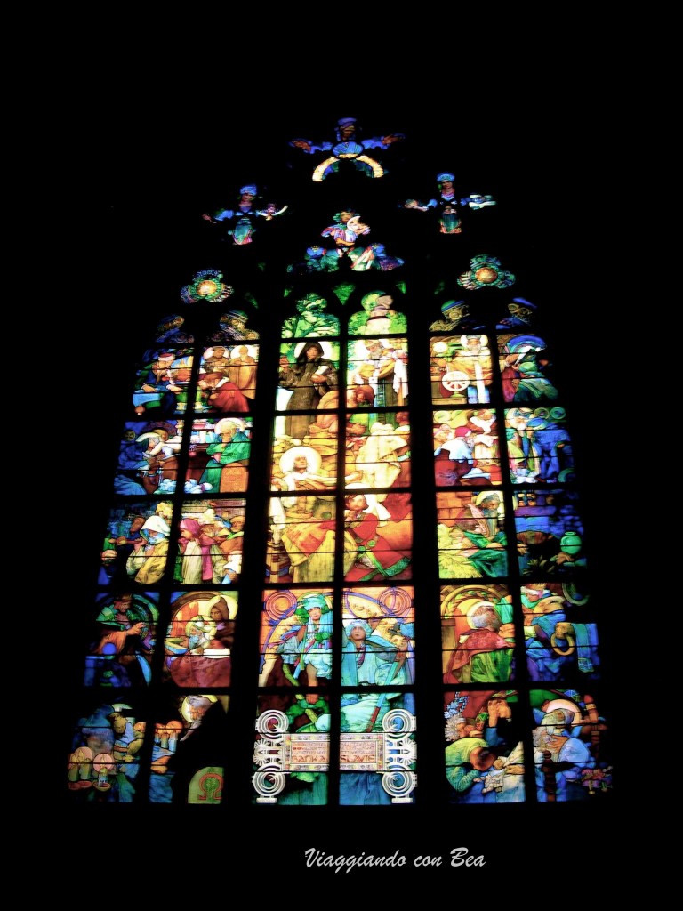 Entrando siamo rimasti colpiti dalle coloratissime vetrate tra cui quelle più belle sono di Alfons Mucha. E che dire della Tomba Imperiale! Considerata uno dei più bei capolavori di Alexander Colyns noto scultore fiammingo. Cos’altro menzionare? L’Oratorio Reale o la Cappella di San Venceslao dalla quale si accede al Tesoro Reale. Ricordiamoci di soffermarci ad osservare, nella facciata meridionale della Cattedrale, la Porta d’Oro decorata con un eccezionale mosaico gotico che raffigura il Giudizio Universale.