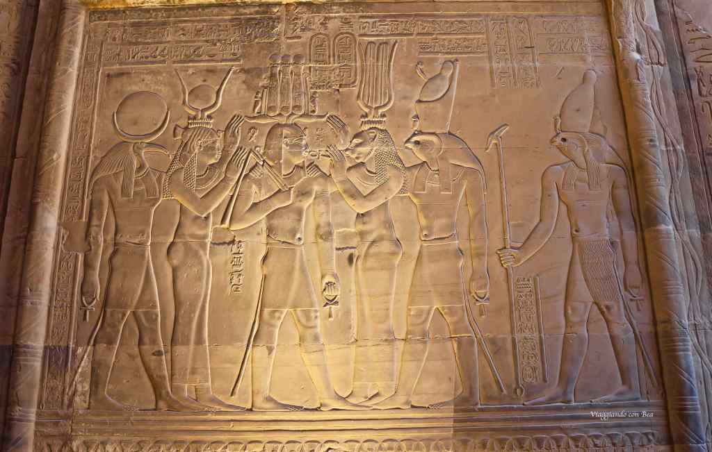 Qui è tutto doppio 🙂 Come già detto il tempio è dedicato a due divinità e così la struttura del tempio è doppia. Troviamo due entrate, una doppia fila di porte parallele, due cortili e due santuari ovviamente separati da un muro divisorio. La parte meridionale è consacrata a Sobek e la parte settentrionale ad Horus.