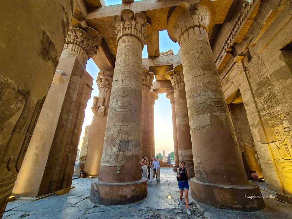 Dinanzi a noi si stagliano imponenti colonne, superiamo l’ingresso ed eccoci all’interno della Sala Ipostila. Volgiamo lo sguardo a sinistra e troviamo 10 colonne decorate con bassorilievi e dipinti murali dedicati ad Horus mentre a destra troviamo quelli dedicati al dio Sobek.