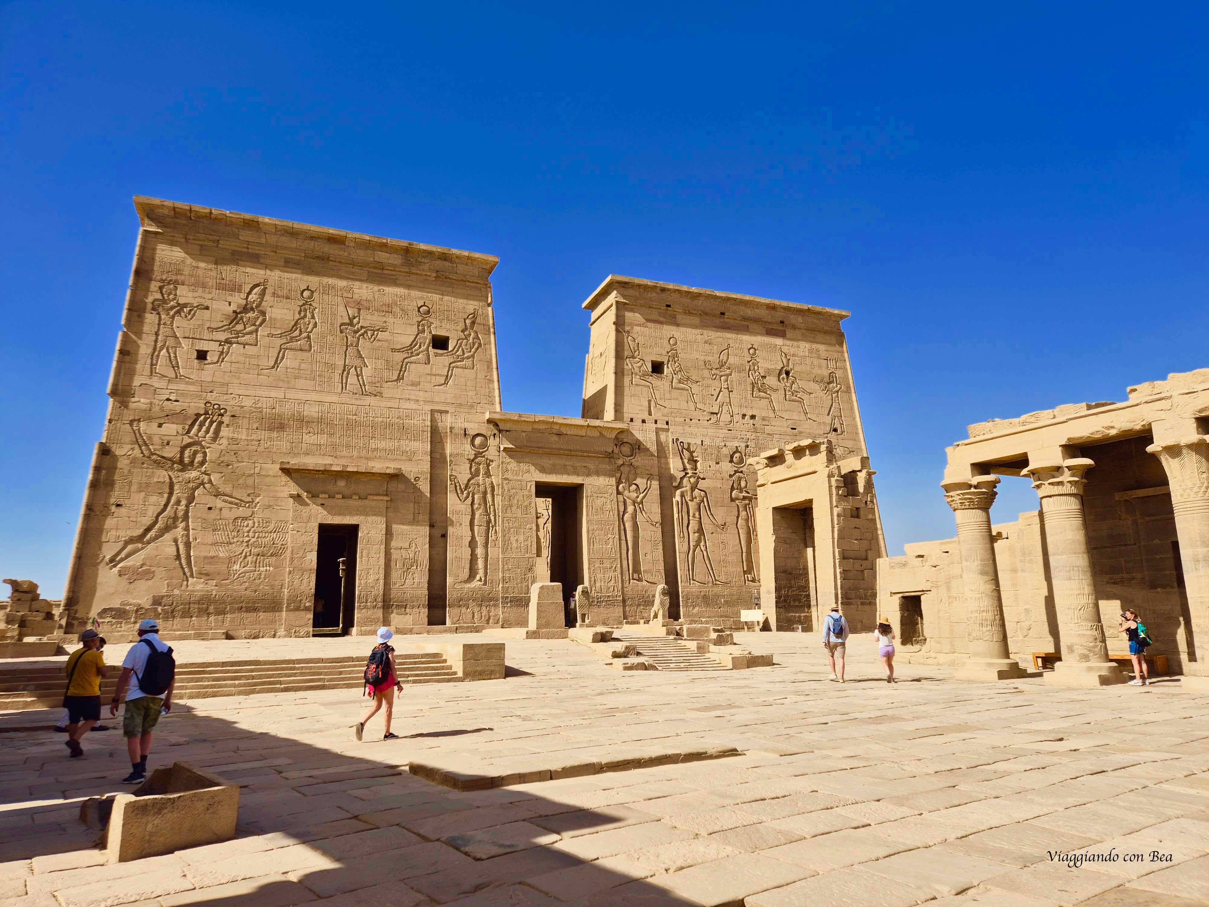 Siamo dinanzi al 1° pilone, ingresso monumentale al tempio. Su un lato si snoda un colonnato con 32 colonne e sul lato opposto troviamo un colonnato in parte danneggiato. Dinanzi a noi si staglia imponente la facciata decorata da bassorilievi che raffigurano Tolomeo XII nell’atto di uccidere i nemici fatti prigionieri. Le scene si svolgono in presenza della Dea Iside.