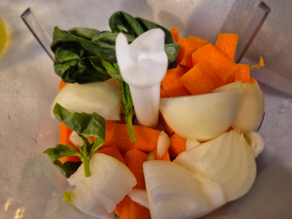 - Per il soffritto: 1 cipolla dorata, qualche foglia di basilico e 2 carote)