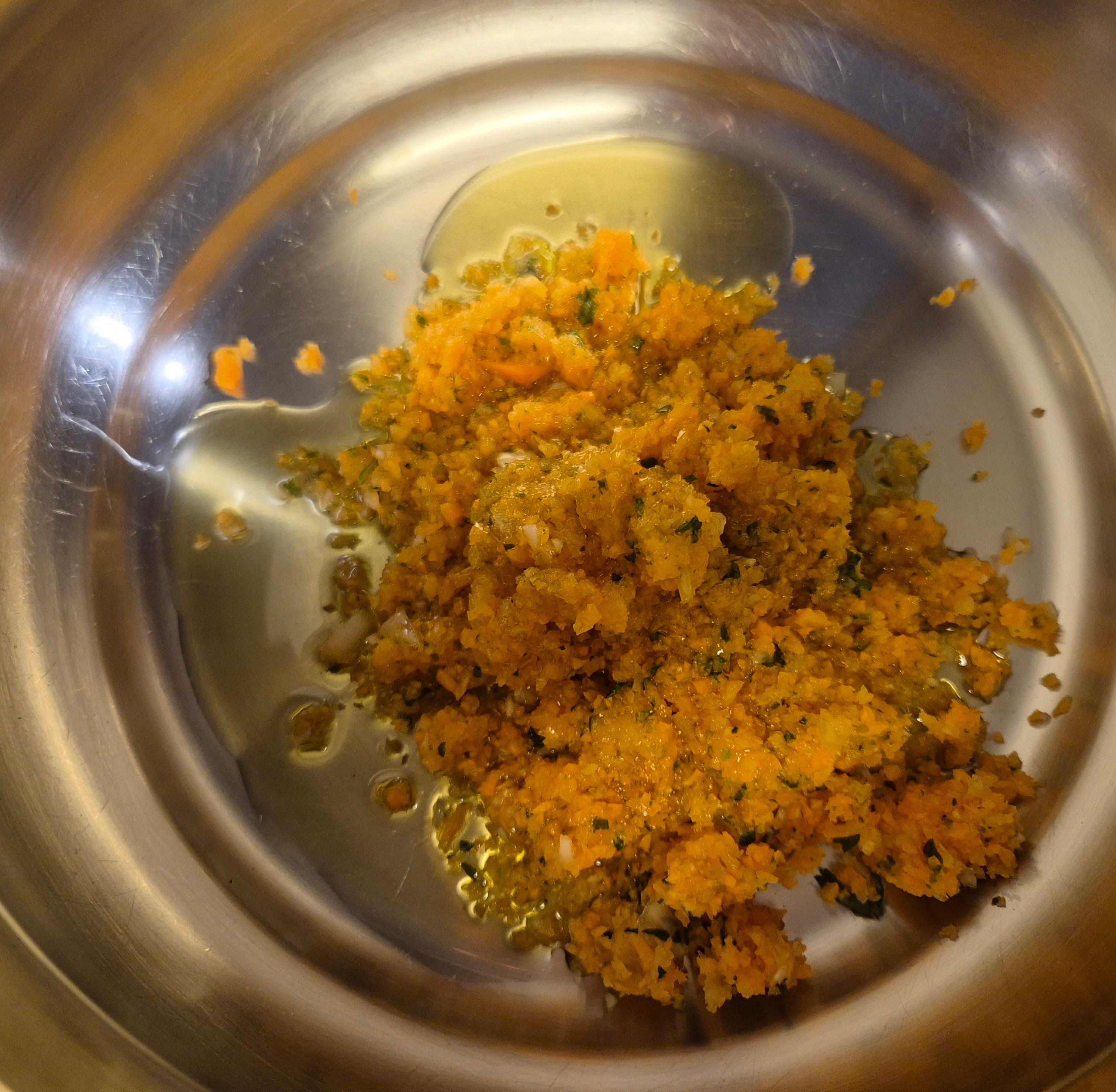 Frullare nel mixer la cipolla, il basilico e le carote e farlo rosolare in padella antiaderente