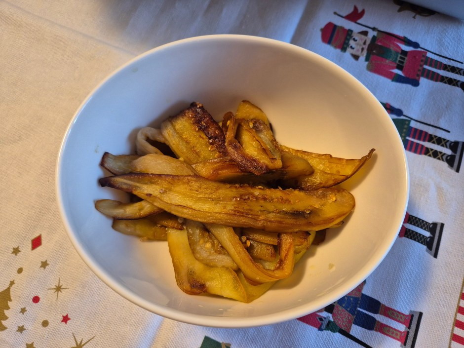 - Tagliare 1 melanzana a fette sottili e soffriggere (queste fette vanno usate come guarnizione)