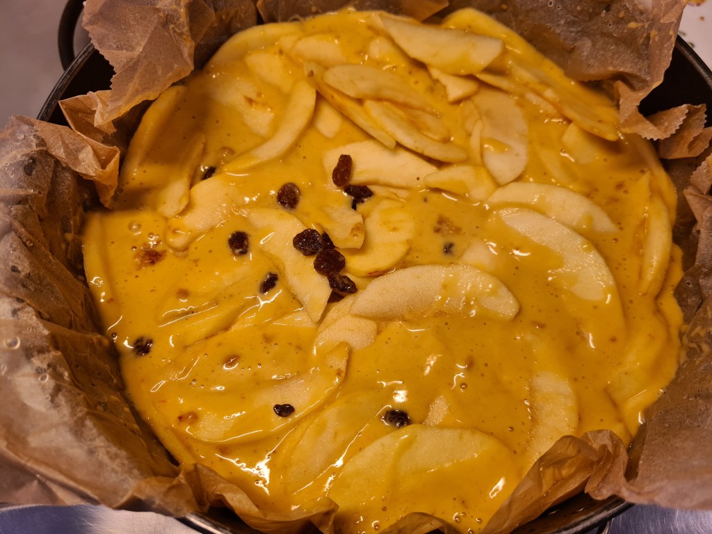 - versare il composto e adagiare le fettine di mele