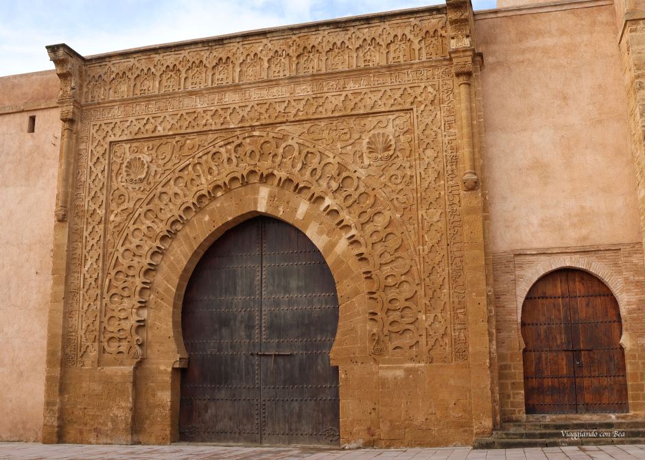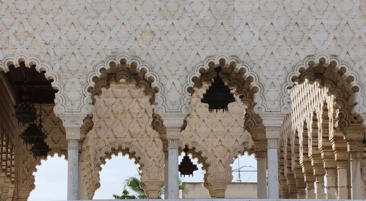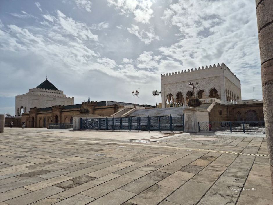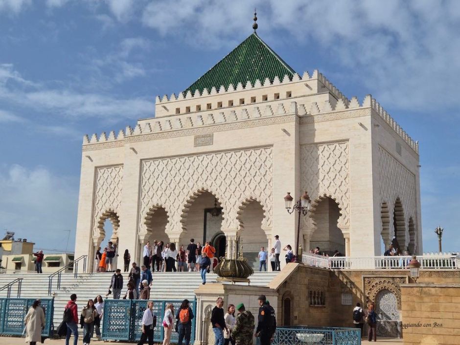 Tornando sui nostri passi, si raggiunge il pullman che ci porterà verso il simbolo del Marocco moderno: il Mausoleo di Mohammed V, un vero capolavoro di artigianato marocchino, edificato tra il 1961 ed il 1971. Due ampie scalinate portano verso l’ingresso del mausoleo rivestito in marmo bianco e con un tetto spiovente realizzato in maiolica verde. L’ingresso è presidiato da uomini della Guardia Reale in alta uniforme.