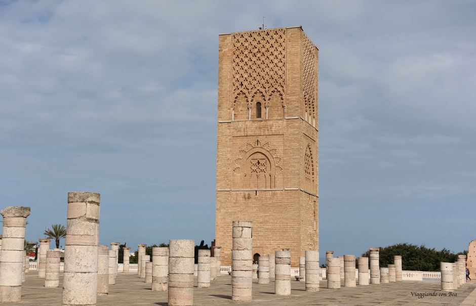 Di fronte al Mausoleo svetta il minareto detto Torre di Hassan: ha una pianta quadrata di 16,20 metri per lato e muri il cui spessore non è inferiore ai 2,5 metri. Tutto intorno alla torre si ergono circa 200 colonne mozze, resti di quello che sarebbe stato il progetto, se fosse stato ultimato, per realizzare la seconda moschea più grande del mondo islamico dell’epoca. Il progetto fu avviato dal sultano Ya’qub al-Mansur verso la fine del XII secolo; i lavori si interruppero bruscamente nel 1199, quando il sultano morì.