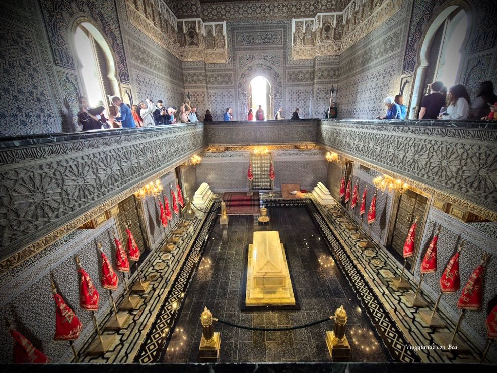 Si può accedere gratuitamente e non si può che rimanere a bocca aperta per la maestosità dell’ambiente. Coperto da una cupola in mogano scolpito e vetro colorato, l’interno custodisce i sarcofagi di Mohammed V (1909-1961) e dei suoi due figli Hassan II (1929-1999) ed il principe Moulay Abdallah.