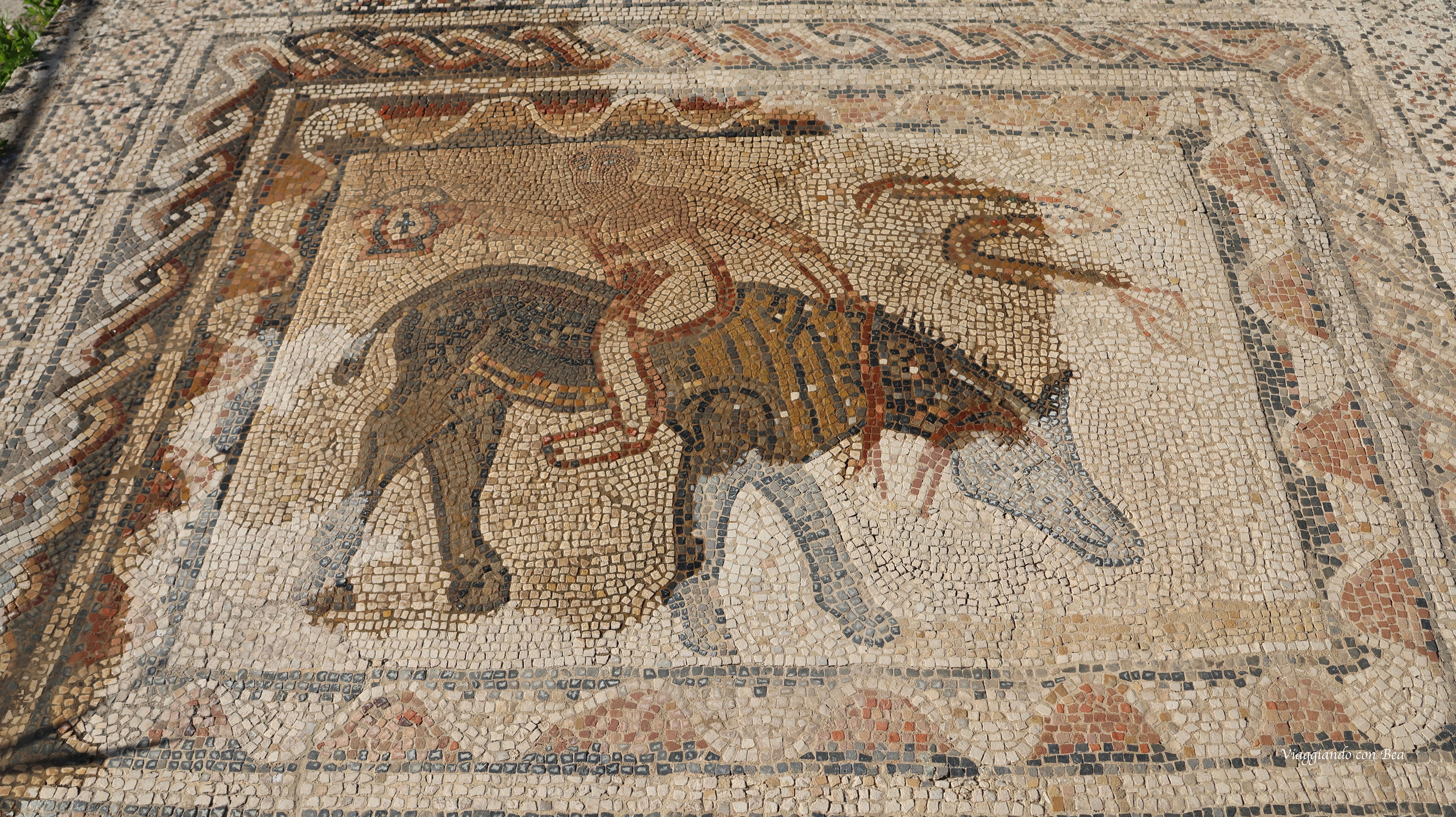 Continuando il nostro tour guidato abbiamo modo di ammirare diversi mosaici che, nonostante la loro lunga esposizione agli agenti atmosferici, sono giunti fino a noi quasi intatti ed in tutto il loro splendore.