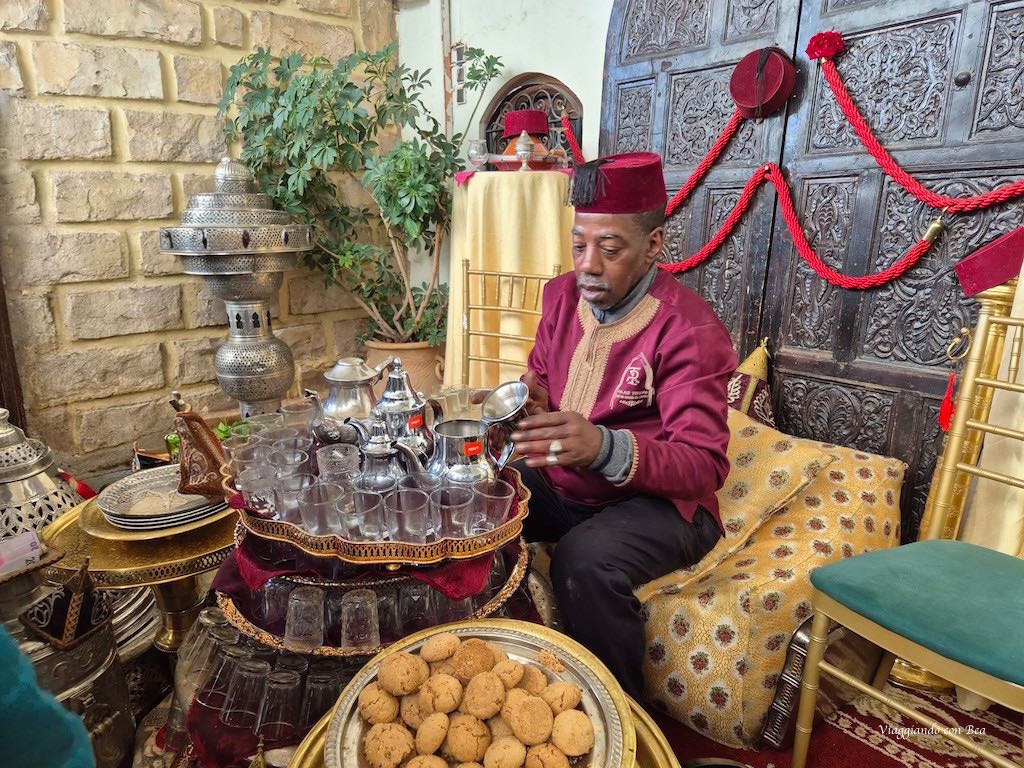 Ma il vero momento di magia arriva alla fine con il rito del tè alla menta, simbolo universale di ospitalità. Non potete capire la bellezza di quei servizi in argento finemente lavorati!! E che dire di quel magico gesto di versare la bevanda dall’alto? Non è solo un esercizio estetico, ma serve ad ossigenare la bevanda sprigionandone tutto l’aroma e creando una leggera schiuma in superficie. In quel bicchiere ci mettono anima e cuore; è il loro modo di dirti “benvenuto” e renderti partecipe della loro cultura.