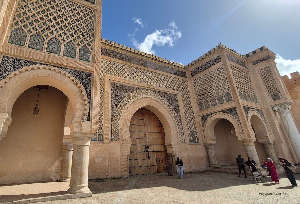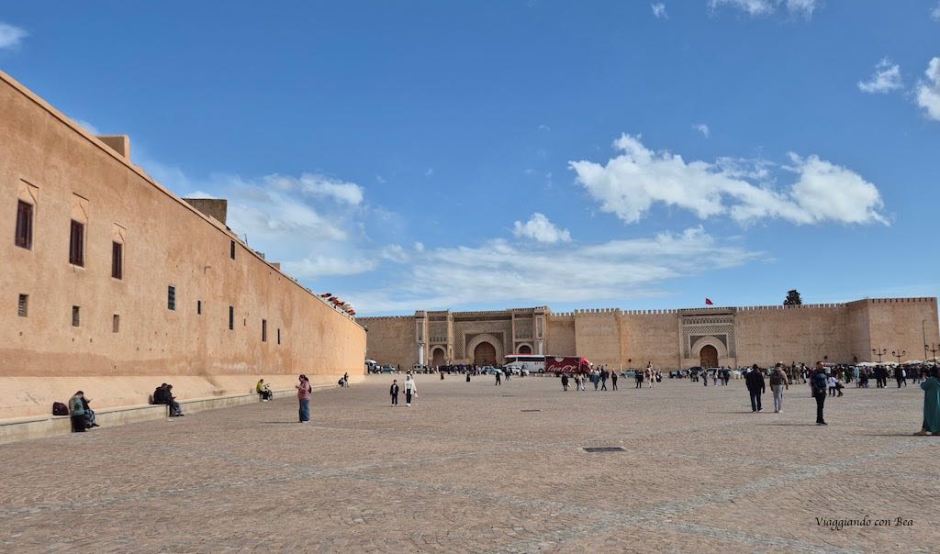 La piazza, animata in ogni ora del giorno, si snoda tra la medina e la città imperiale. A sud-est si erge maestosa la porta d’ingresso alla città imperiale, bab el-Mansour. La facciata presenta una preziosa decorazione con intrecci a rilievo su fondo in ceramica e mosaici di un bellissimo verde.
